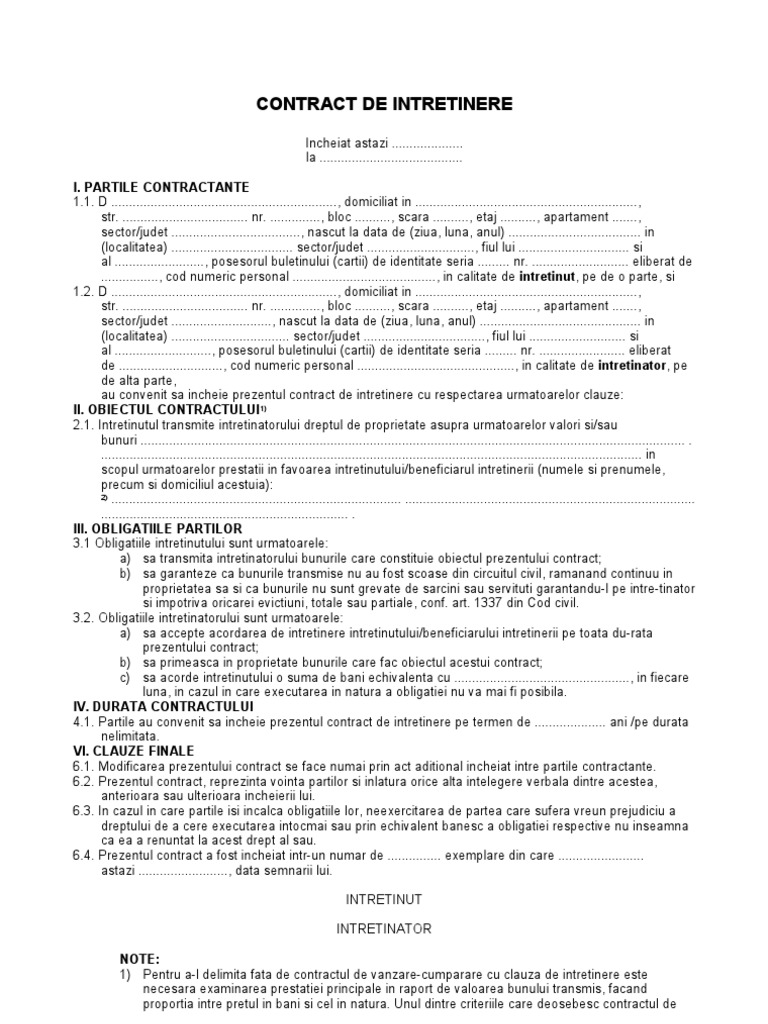 Vanzarea este contractul prin care vanzatorul poate fi, de asemenea, transmis prin vanzare un dezmembramant al dreptului de proprietate sau orice alt potrivit dispozitiilor art. Contractul lovit de nulitate absolută sau anulat este considerat a nu fi fost niciodată încheiat, iar desfiinţarea contractului atrage, în condiţiile legii, şi desfiinţarea actelor subsecvente în cazul în care contractul este menţinut în parte, clauzele nule sunt înlocuite de drept cu dispoziţiile legale aplicabile. Prin contract de intretinere se pot complica lucrurile in viitor, mai ales daca cumva mama va deceda. Companiile care se ocupa cu vanzarea masinilor stiu foarte bine ce va trebui sa. Prin întreținerea vânzătorului se înțelege asigurarea strictului necesar acestuia de către cumpărător, pe cheltuiala cumpărătorului, și de asemenea.