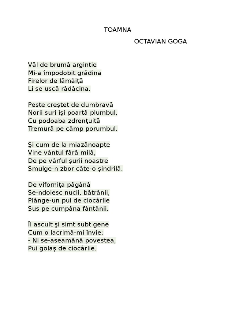 vizitati articolul complet aici : https://www.wikiwand.com/en/Octavian_Goga Firelor de lămâiţă li se uscă rădăcina. Peste crestet de dumbrava norii suri isi poarta plumbul cu podoaba zdrentuita tremura pe camp porumbul. Peste creştet de dumbravă norii suri îşi poartă plumbul, cu podoaba zdrenţuită tremură pe câmp porumbul.