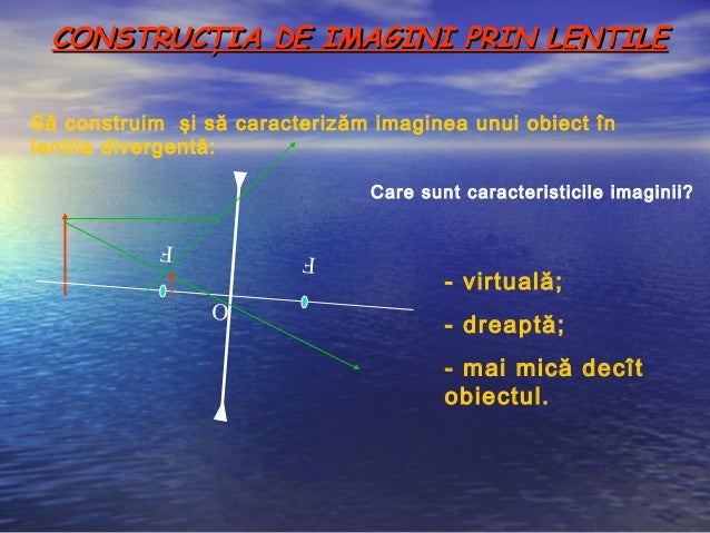 vizitati articolul complet aici : https://www.slideserve.com/tryphena/constructii-de-imagini-n-lentile Constructia imaginii in situatia p<f este prezentata in ura 3. Lentila divergentă are focarele inversate, adică focarul imagine este situat în spațiul obiect. Imagini în lentile divergentelentila divergentă sau lentila concavă împrăștie razele de lumină, adică transformă un fascicul paralel de raze de lumină în.