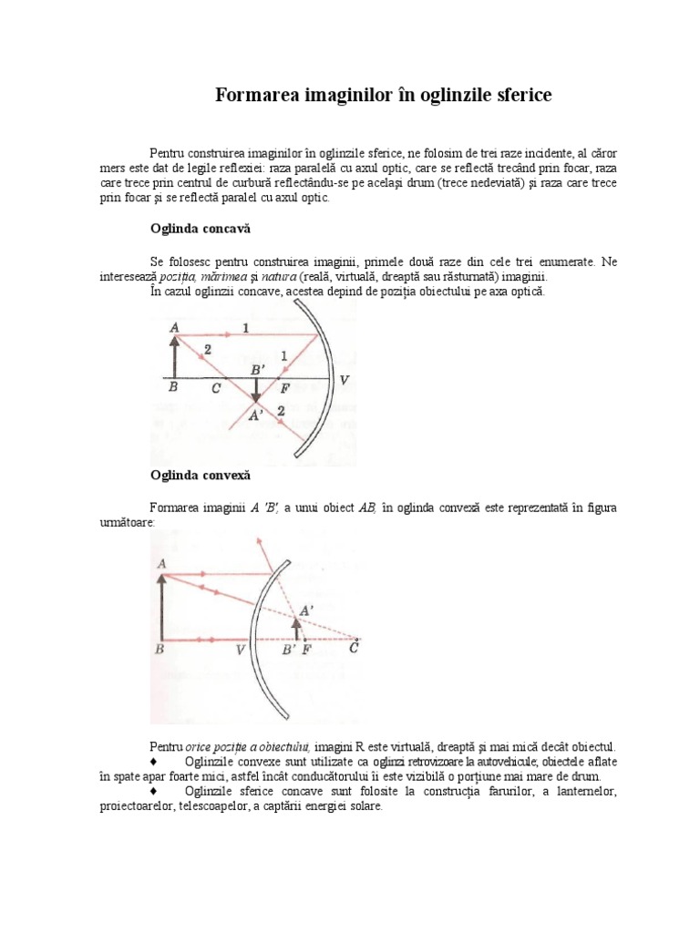 6 formarea imaginii în oglinda plană imaginea se formează simetric în raport cu oglinda. Formarea imaginii a 'b', a unui obiect ab, în oglinda convexă este reprezentată în figura următoare: Pentru analiza formării imaginilor în lentile convergente revedeti teoria ce contine: