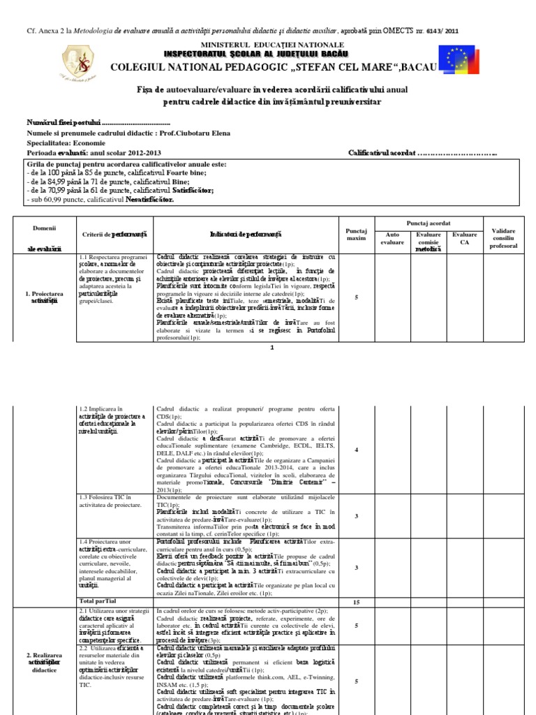 Fiecare cadru didactic primeşte fişa de autoevaluare/evaluare şi îşi face autoevaluarea pe baza fişei primite şi o va depune şefului de catedră până la aeeast chestionar este destinat aprecierii semestriale a activităţii personalului didactic. Fia cadru de autoevaluare /evaluare n vederea acordrii calificativului anual. In randurile de mai jos este prezentata o fisa de evaluare a personalului din subordine, care este structurata pe categorii.